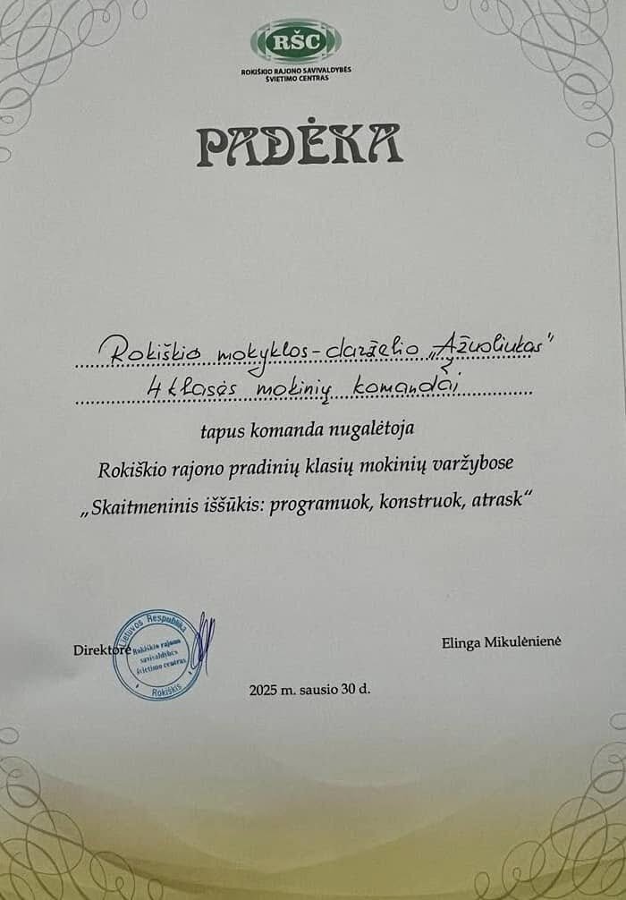 Sveikiname 4 klasės mokinių komandą, tapus rajono pradinių klasių varžybų ,, Skaitmeninis iššūkis- programuok, konstruok, atrask” nugalėtojais. Didžiuojamės mokiniais ir jų mokytojais Sigitu R. ir Loreta S.